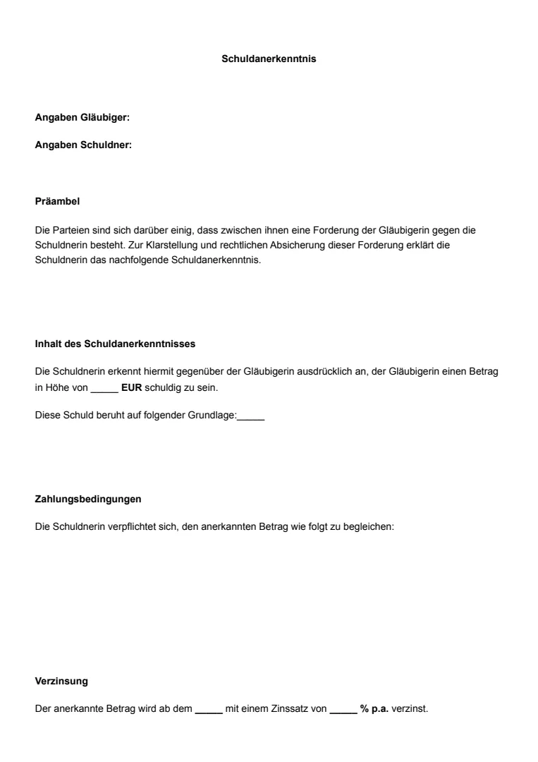 - Ort, Datum und Unterschriften: Für die Rechtswirksamkeit sind der Ort der Ausstellung, das Datum und die eigenhändigen Unterschriften beider Parteien unerlässlich. Die Unterschrift des Schuldners bestätigt das Schuldanerkenntnis nach § 781 BGB.