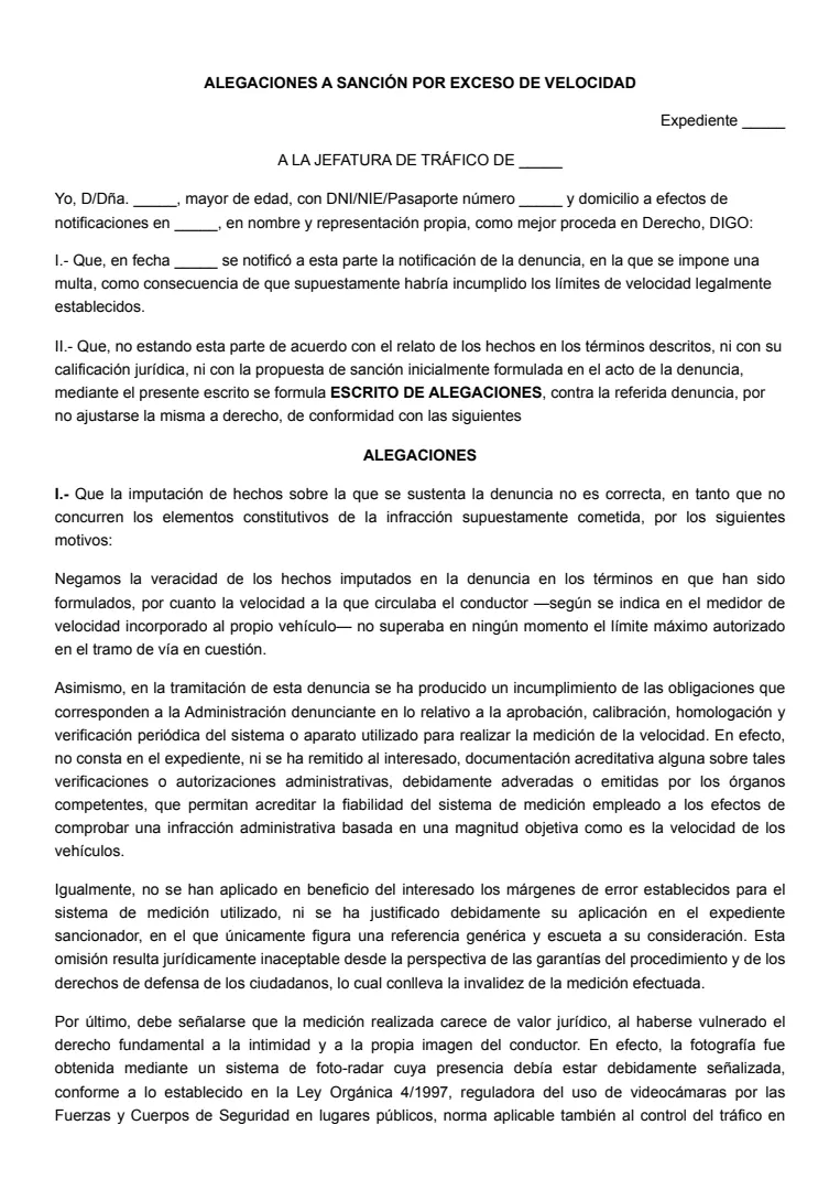 Alegaciones a multa por exceso de velocidad detectada con radar